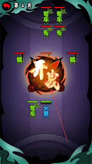 1、在第4关开始前,查看敌方阵容弩车、髅等和己方阵容弩车、火勇、爆龟,点击开战进入战斗。
