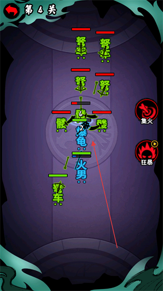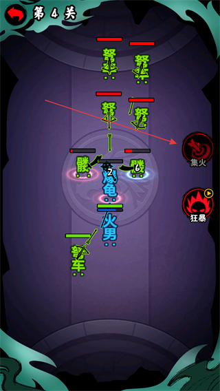 2、战斗中操控己方角色爆龟、火勇等攻击敌方单位,利用“集火”技能集中火力打击单个敌人,快速削减其血量。