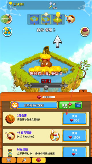 3、可使用红宝石解锁增益效果,如2倍伤害+1自动攻击等,提升攻击效率,加快怪物击杀速度。