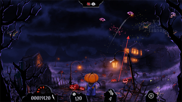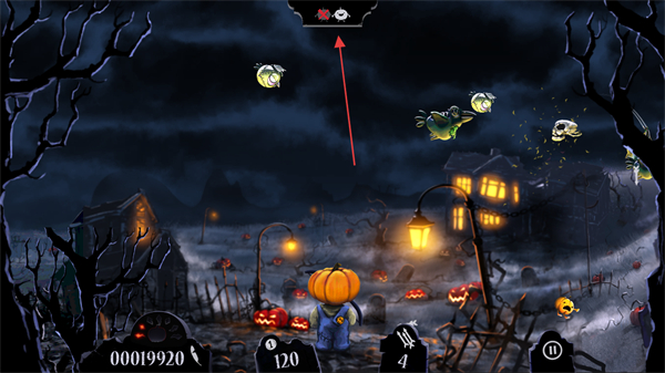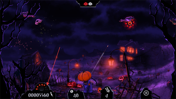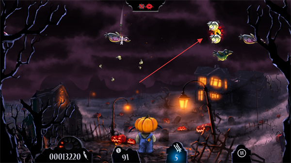 1、操控南瓜头角色,瞄准空中的僵尸鸟、骷髅等敌人发射武器,击中可得分。