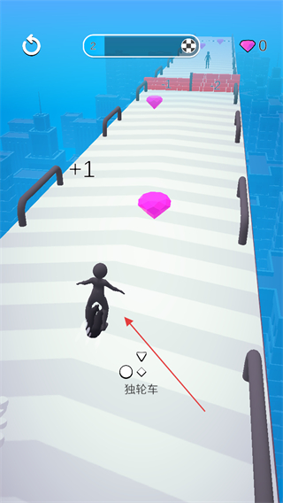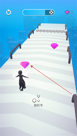 1、操控角色驾驶独轮车在赛道上行驶,收集粉色钻石,每收集一颗钻石可获得相应分数和爱心值。