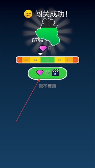 4、当分数达到关卡要求时,即可闯关成功,屏幕显示闯关成功,可选择领取钻石奖励或进入下一关。