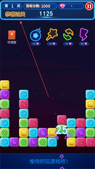 3、持续消除方块,当得分达到目标分数时,即可通关,屏幕会显示恭喜过关。