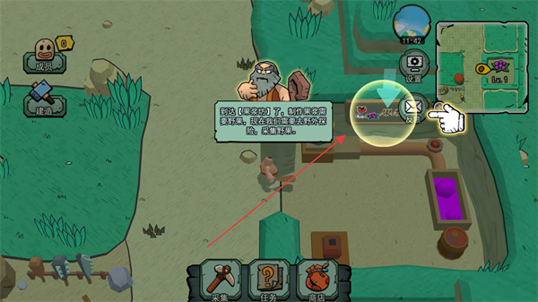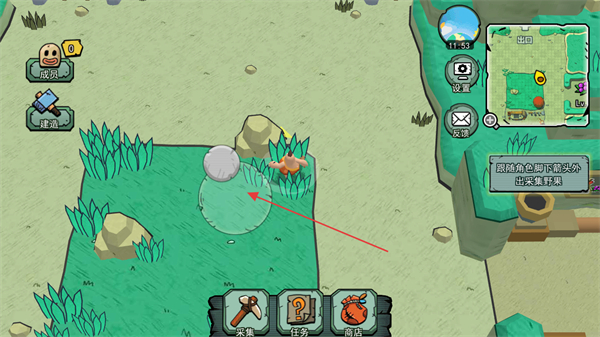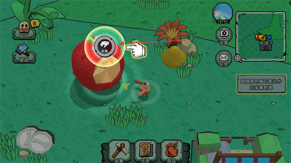 2、在地图中寻找资源点,如石块、果树等,靠近后进行采集操作,获取建设和生存所需资源。