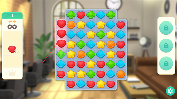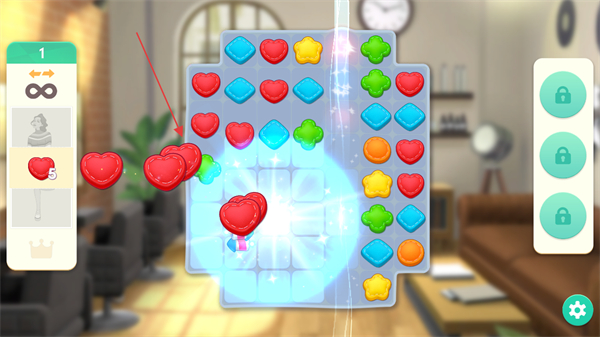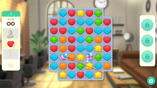 1、观察关卡目标如收集爱心,寻找三个及以上相同图案的糖果,通过交换位置使其连成一线消除,完成收集任务。