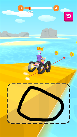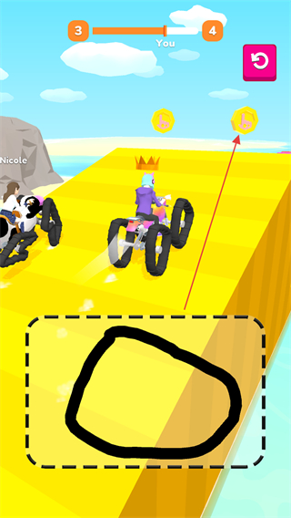 2、驾驶载具在黄色赛道收集金币,同时保持行驶稳定,拉开与对手的差距。