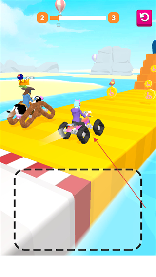 1、驾驶四轮车在黄色赛道行驶,超越对手,收集金币,提升排名。
