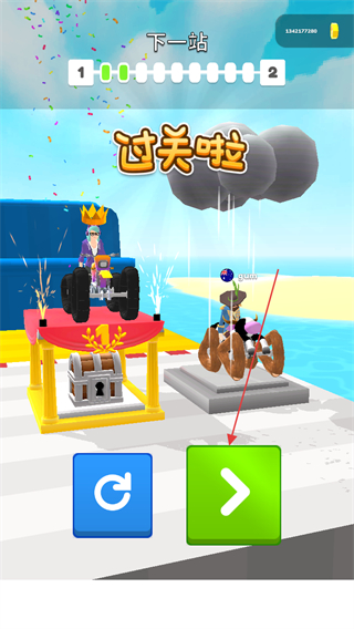 4、过关后点击绿色箭头按钮继续,进入下一站,挑战更高关卡。