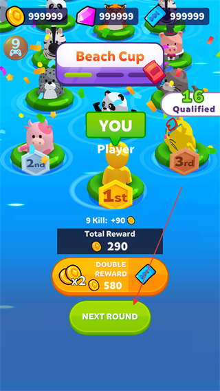 4、顺利到达终点泳池后,根据排名和击杀数领取奖励,点击NEXTROUND进入下一轮比赛,继续挑战更高分数和排名。