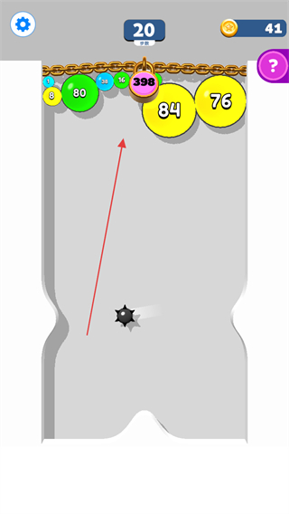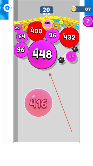 1、控制黑色尖刺类敌人避开上方的气球群,同时让下方的气球上升与上方气球合并,形成更大数字的气球。