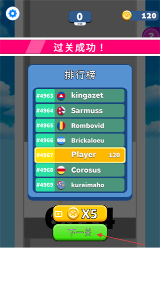 4、成功通关后,可在排行榜查看名次,点击“下一关”继续挑战更高关卡,争取获得更高分数和更多金币。