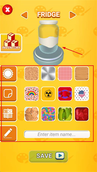 1、进入游戏后,可进入冰箱定制界面,选择不同的材质、图案、贴纸等,设计完成后点击SAVE保存。