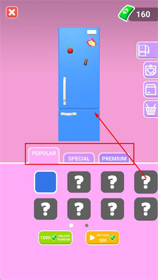 2、在冰箱选择界面,可选择POPULAR、SPECIAL、PREMIUM等不同分类的冰箱样式,花费金币解锁喜欢的冰箱。