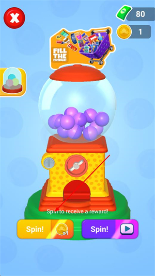 3、找到扭蛋机界面,点击Spin按钮,消耗一块金币,转动扭蛋机获取物品奖励。
