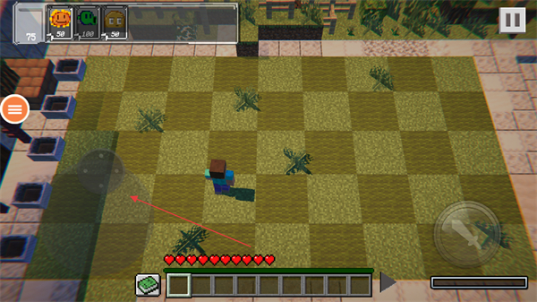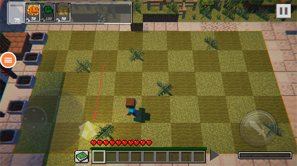 1、操控角色移动,收集黄色方块资源,用于种植植物。
