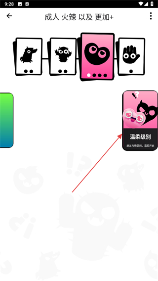 1、选择成人火辣以及更加+模式中的粉色卡牌,进入温柔级别游戏环节。
