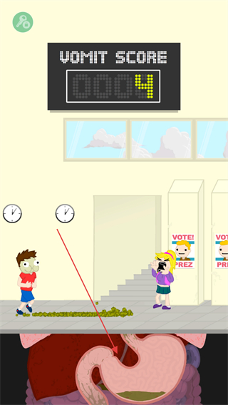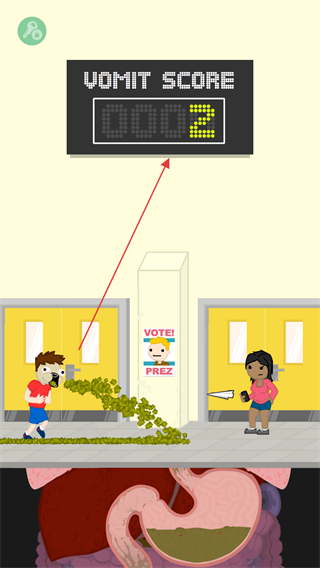 1、操控角色移动,在场景中收集呕吐物,提升呕吐分数。