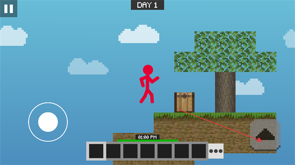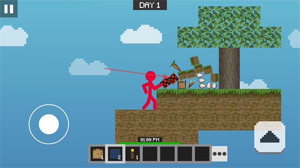 1、操控左侧虚拟摇杆移动火柴人,在空岛中探索,留意资源分布。