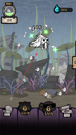 2、持续攻击小骷髅,收集绿色光点资源,提升自身数值,如右上角的资源数量从1810增长到1960。
