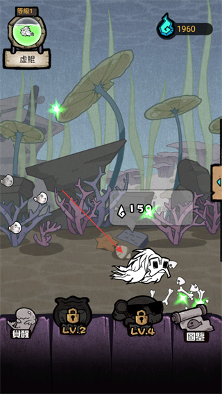 1、进入游戏,处于等级1,操控虚鲲点击屏幕攻击周围白色小骷髅,获取经验值和资源。