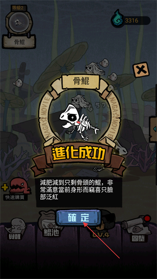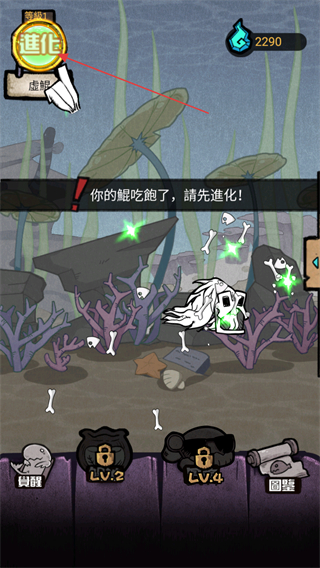 3、当虚鲲吃饱满足进化条件,出现提示你的鲲吃飽了,請先進化!,暂停攻击准备进化。