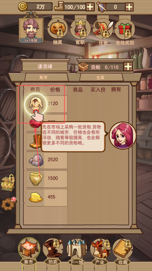 1、进入游戏后首先需要仔细查看集市界面中紫色商品的价格差异,通过对比不同商品的进价和售价,寻找最佳的交易机会,为后续的商业运作奠定基础。