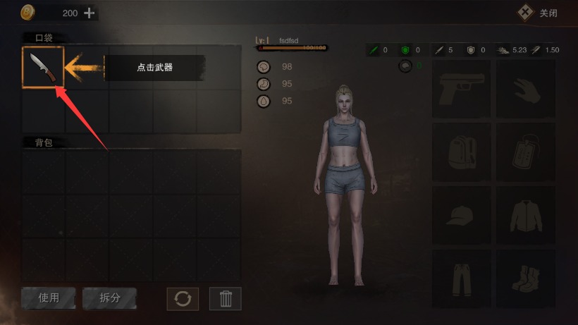 3、拾取散落在地面的各类武器道具,点击背包按钮查看已收集的物品清单。