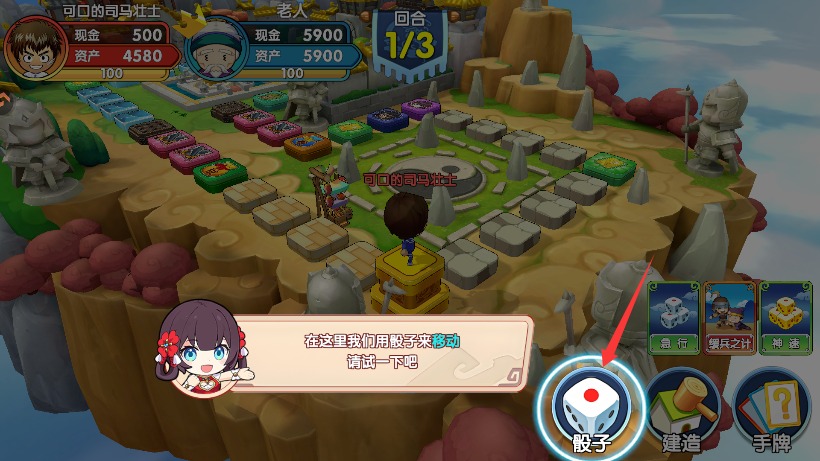3、点击骰子按钮进行投掷决定具体步数,根据点数在棋盘格上移动角色位置前进。