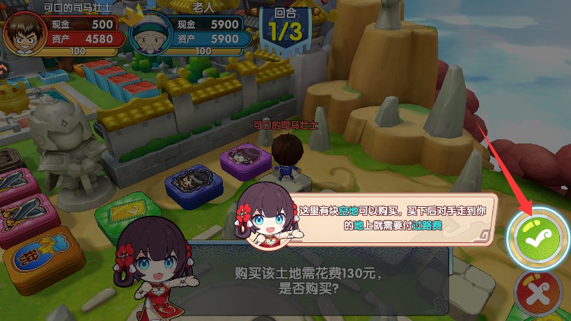 4、停留在无主空地可点击购买土地产权,当对手经过时需支付相应过路费用金额。