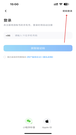 3、进入登录的界面内,点击右上方密码登录的按钮。