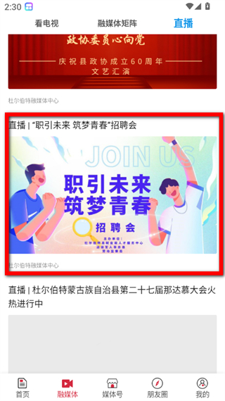 3、在直播列表页面,选择目标直播如职引未来筑梦青春招聘会直播,进入直播播放页面。