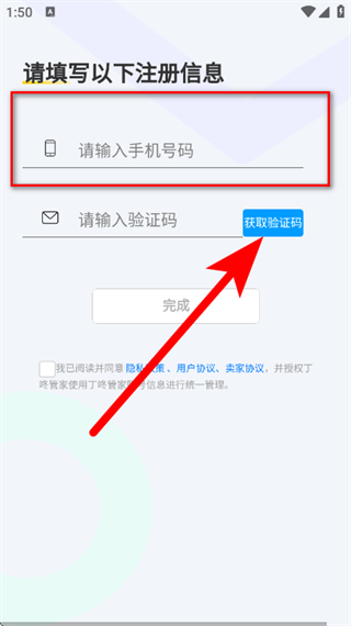 4、输入验证码,勾选已阅读并同意相关协议后,点击完成,完成账号注册。