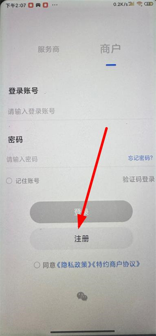 1、在APP登录页面,点击商户选项,切换到商户登录注册界面。