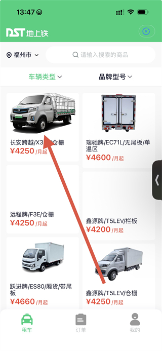 4、在车辆列表页面,选择目标车辆如长安跨越/X3EV/仓栅,进入车辆详情页面。