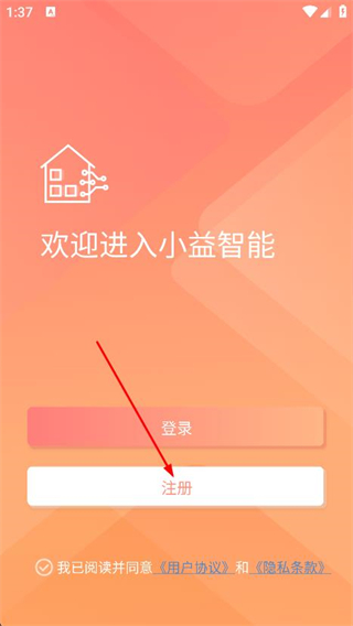 1、打开小益智能,选择并点击注册按钮进入注册页面。
