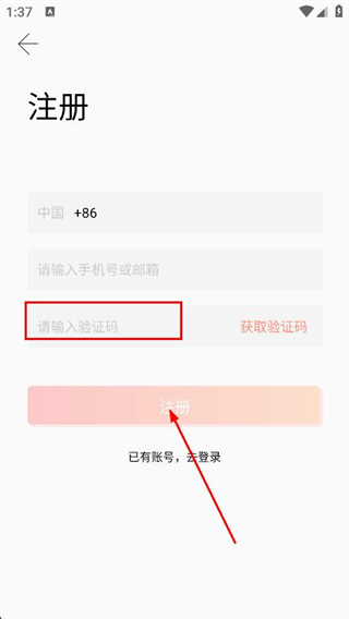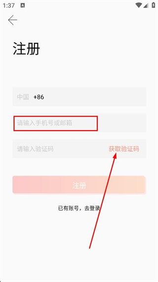 2、在注册页面,输入手机号或邮箱,点击获取验证码。