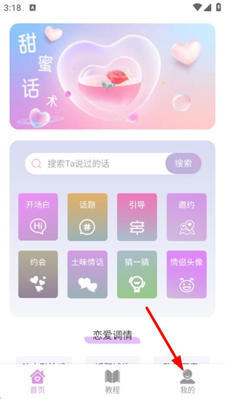 1、在恋爱情话助手首页,点击右下角我的选项,进入个人页面。