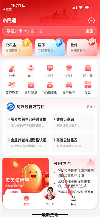 1、在京民通首页,点击右下角我的选项,进入个人页面。