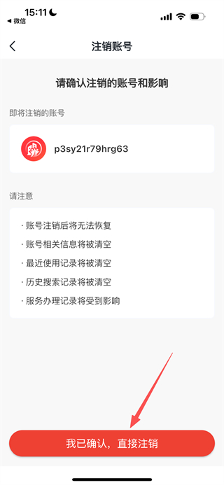3、在注销确认页面,阅读提示后点击我已确认按钮,完成账号注销。