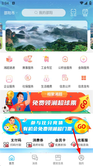 1、在我的邵阳首页,点击右下角我的选项,进入个人页面。