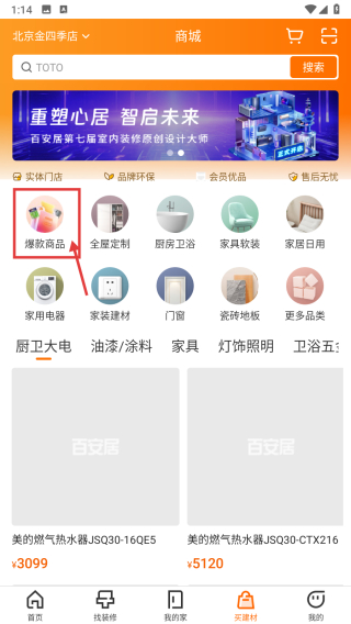 1、打开装修服务类APP,点击底部买建材选项,进入商城页面。