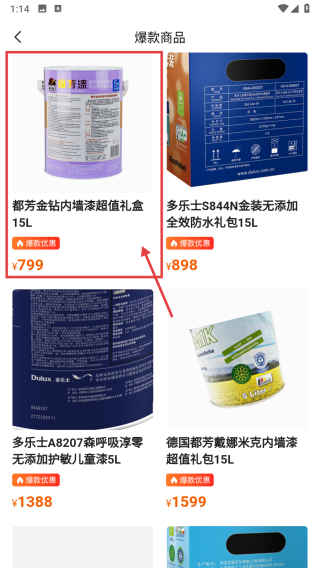 3、在爆款商品列表里,选择都芳金钻内墙漆超值礼盒15L条目,进入商品详情页。