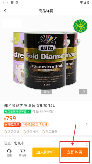 4、在商品详情页,点击立即购买按钮,进行该款内墙漆的购买操作。