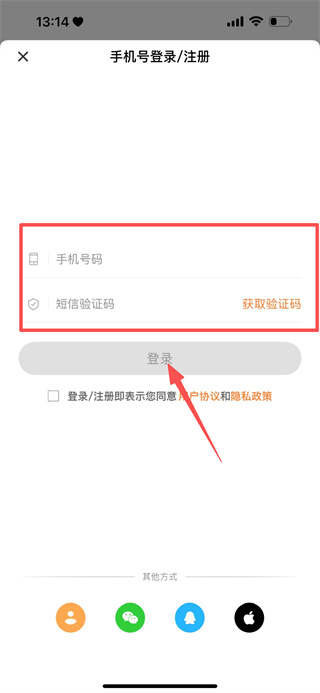 3、点击手机号登录图标,进入手机号登录/注册页面。