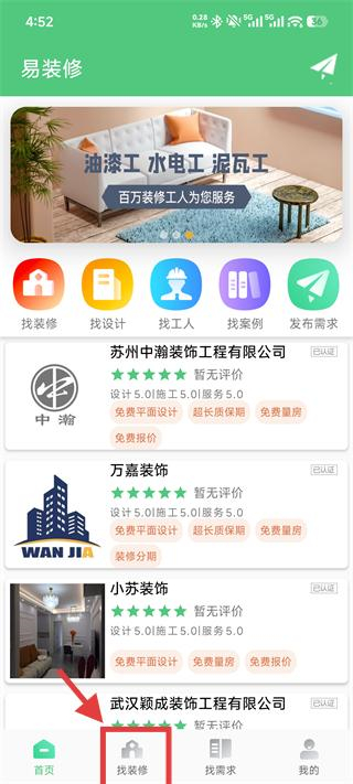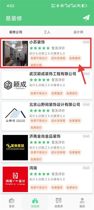 1、打开装修服务类APP,点击底部找装修选项,进入装修公司列表页面。