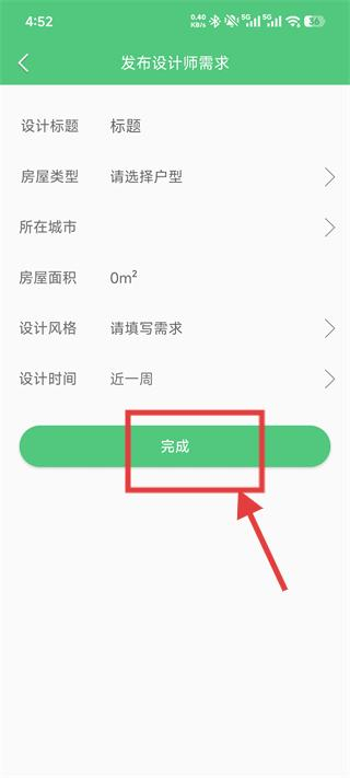 4、在发布设计师需求页面,填写设计标题、房屋类型、所在城市、房屋面积、设计风格、设计时间等信息后,点击完成按钮,提交设计师需求。