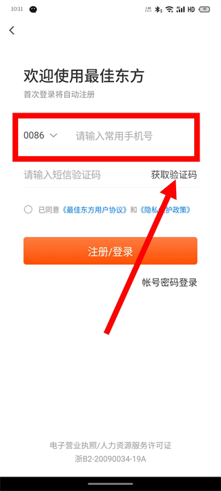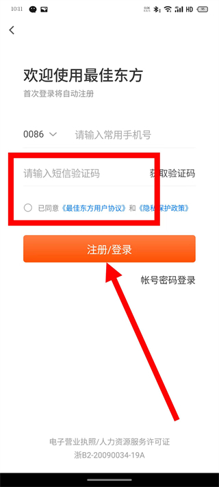 3、输入收到的短信验证码,勾选同意用户协议和隐私政策,点击注册/登录按钮,即可完成注册流程。