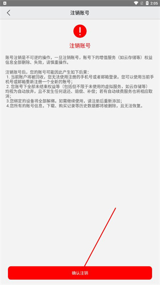 5、在注销账号说明页面,点击确认注销,提交账号注销申请。