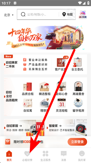 1、打开自如租房,点击底部必看好房,进入必看好房页面。