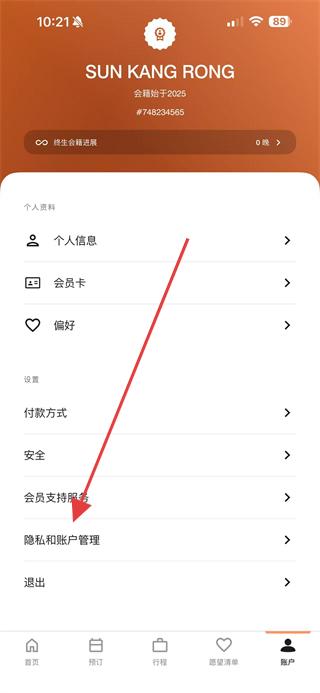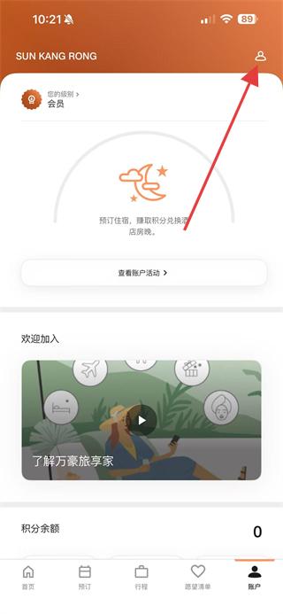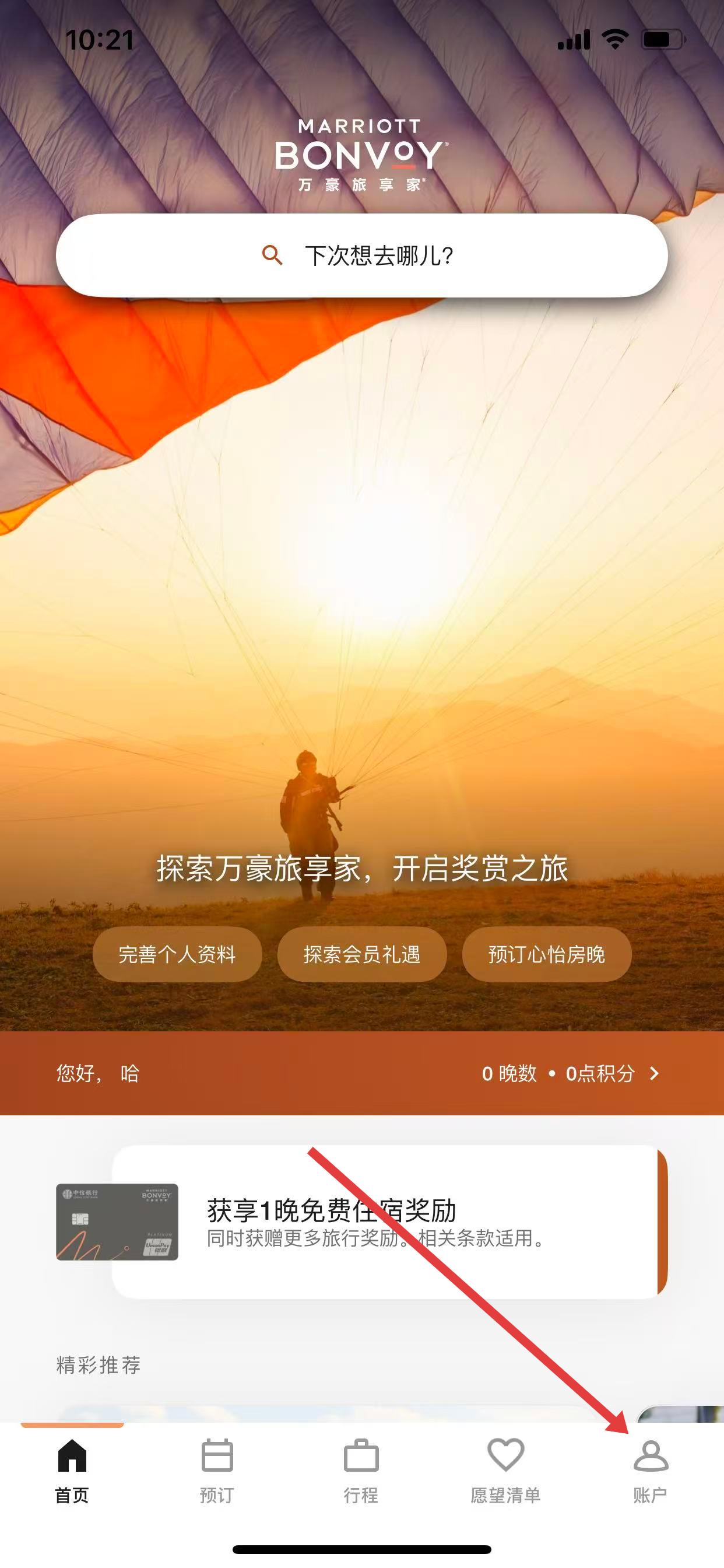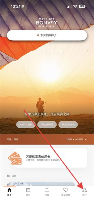 1、打开万豪旅享家APP,点击底部导航栏的账户选项,进入个人页面。